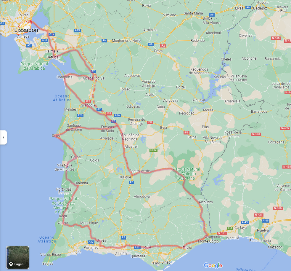 3 nachten in Sétubal, 2 nachten Castro Verde, 4 nachten Mertola, 4 nachten Tavira, 2 nachten Silves, 2 nachten Aljezur, 3 nachten Vila Nova de Milfontes, 1 nacht Lissabon.