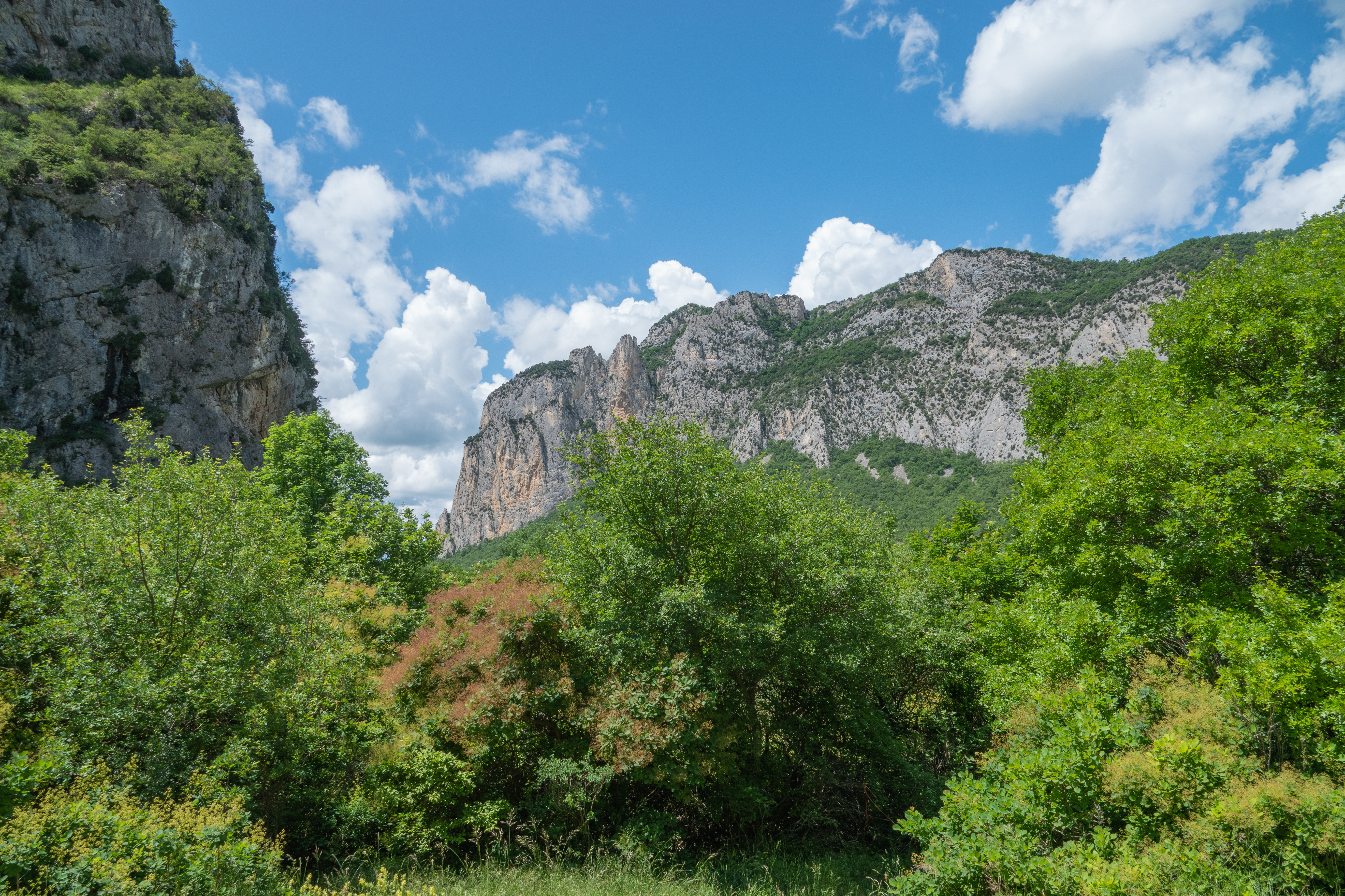 Maar het werd steeds mooier en waar de D70 bij een bruggetje over het riviertje la Vèbre komt, zijn een paar parkeerplaatsen (Le Pertuis). Het bleek een goed startpunt voor diverse wandelingen of tussenstop voor een meer uitdagende lange-afstandswandeling. Hier hebben wij de auto achtergelaten voor een korte wandeling. Hoge kalkrotsen torenden indrukwekkend boven ons uit, de Vèbre kabbelde rustig voort en over een gelijkmatig pad langs de overzijde van het riviertje liepen wij door het bos richting Saoû.