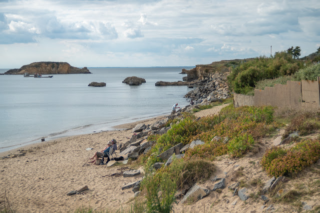 Maandagmiddag hebben we de fietstocht van de vorige dag voltooid, maar dan met de auto : de stranden en okerkleurige kliffen waar Pénestin bekend om staat. Met name het strand van Mine d'Or, dat zijn naam dankt aan het feit dat de klif vroeger een goudmijn is geweest. Al tijdens WOI is de mijn overigens gesloten bij gebrek aan rendement. Wij vonden een parkeerplaats en hebben eerst een stuk van het